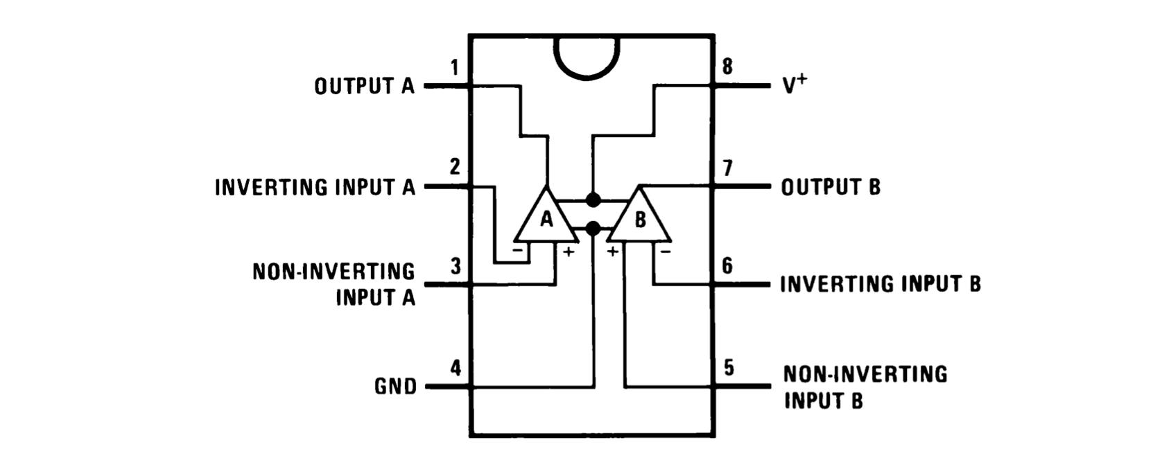Not all op amps have the same pin connections, but all 8-pin dual op amps have these exact same pin connections. This is nice because you can build your circuit with one model of dual op amp, and then pop it off and put different one on and see if you can hear or otherwise find any difference.